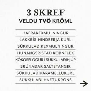 Lakkríssúkkulaðisósa, lakkrís-hindberjakurl, súrt hindberjagúmmí.